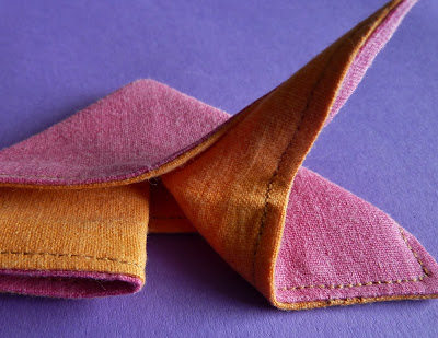 Je naait twee gekleurde lapjes (12.5 cm bij 9.5 cm) op elkaar als een soort speldenkussen die je niet opvult.